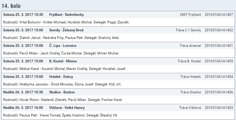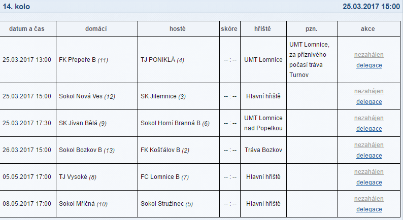 v sobotu 25.3.2017 startují úvodními zápasy jarní části KP a OP mužů…áčko odehraje svůj zápas v České Lípě, béčko si bude muset min.týden počkat protože zápas ve Vysokém n/J byl pro nevhodný stav hrací plochy odložen na 5.5. od 17:00 h…